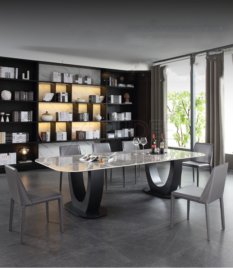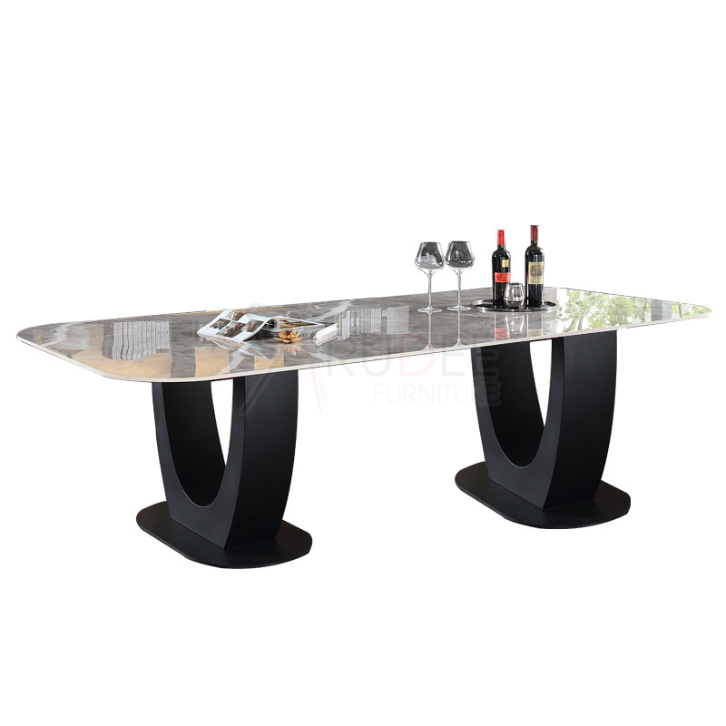 โต๊ะอาหารหินอ่อนสังเคราะห์ โครงขาคู่สแตนเลสสีดำ