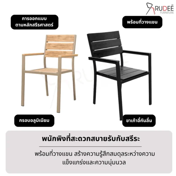 - เก้าอี้ตัวนี้ไม่เพียงแต่ทนต่อสภาพอากาศเท่านั้น แต่ยังกันน้ำ กันแดด และทนต่อการกัดกร่อน